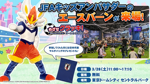 3月28日(土)に東京ドームシティのセントラルパークで、東京ドームシティの春やすみ2026と連動した「JFA チャレンジゲーム めざせクラッキ!」を“特別バージョン”として実施します!JFAキッズアンバサダーのエースバーンも来場予定。