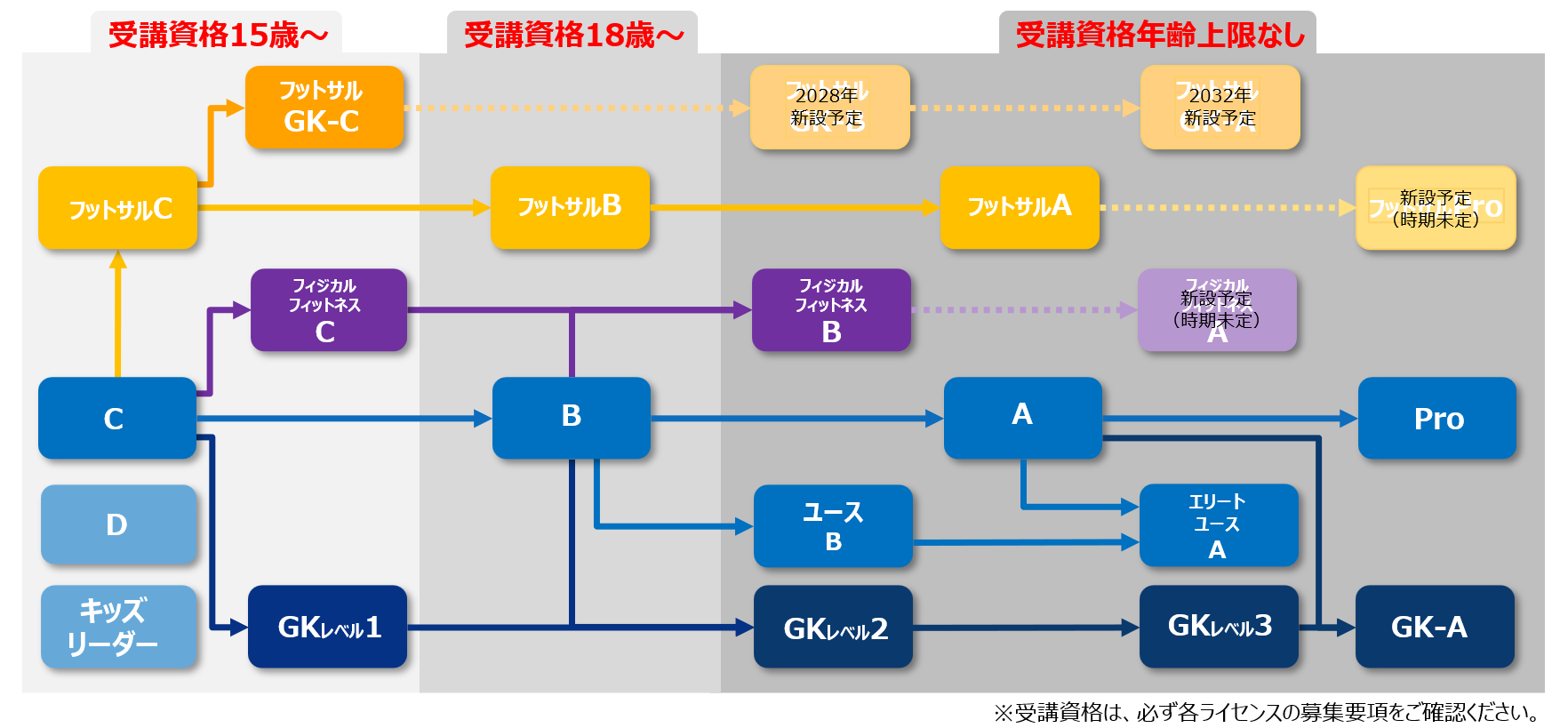 そこからさらに学び続けたいという指導者は、Aジェネラルライセンス、エリートユースA(2024年新設)、ユースB(2023年新設)、GK、フィジカルフィットネス、フットサルといった、より専門的なライセンスに挑戦していただきたいと考えています。