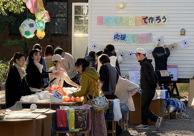 トレーラーハウス周辺をめぐってスタンプを集めながら楽しむスタンプラリーです。スタンプは、ジャンプしたり背伸びをしたり、誰かと協力しないと押せない仕掛けもあり、自然と「一緒にやろう!」という声が生まれます。ヒントを頼りに次の場所を探す宝探し形式なので、動いて、探して、話しながら進んでいきます。ラリーの最後には、集めたスタンプに加えて、いろいろな国の言葉で応援メッセージや好きな言葉を書き込み、オリジナルの応援フラッグを完成させます。遊びながら、ことばや気持ちを重ねていく、誰でも参加できる体験型プログラムです。
