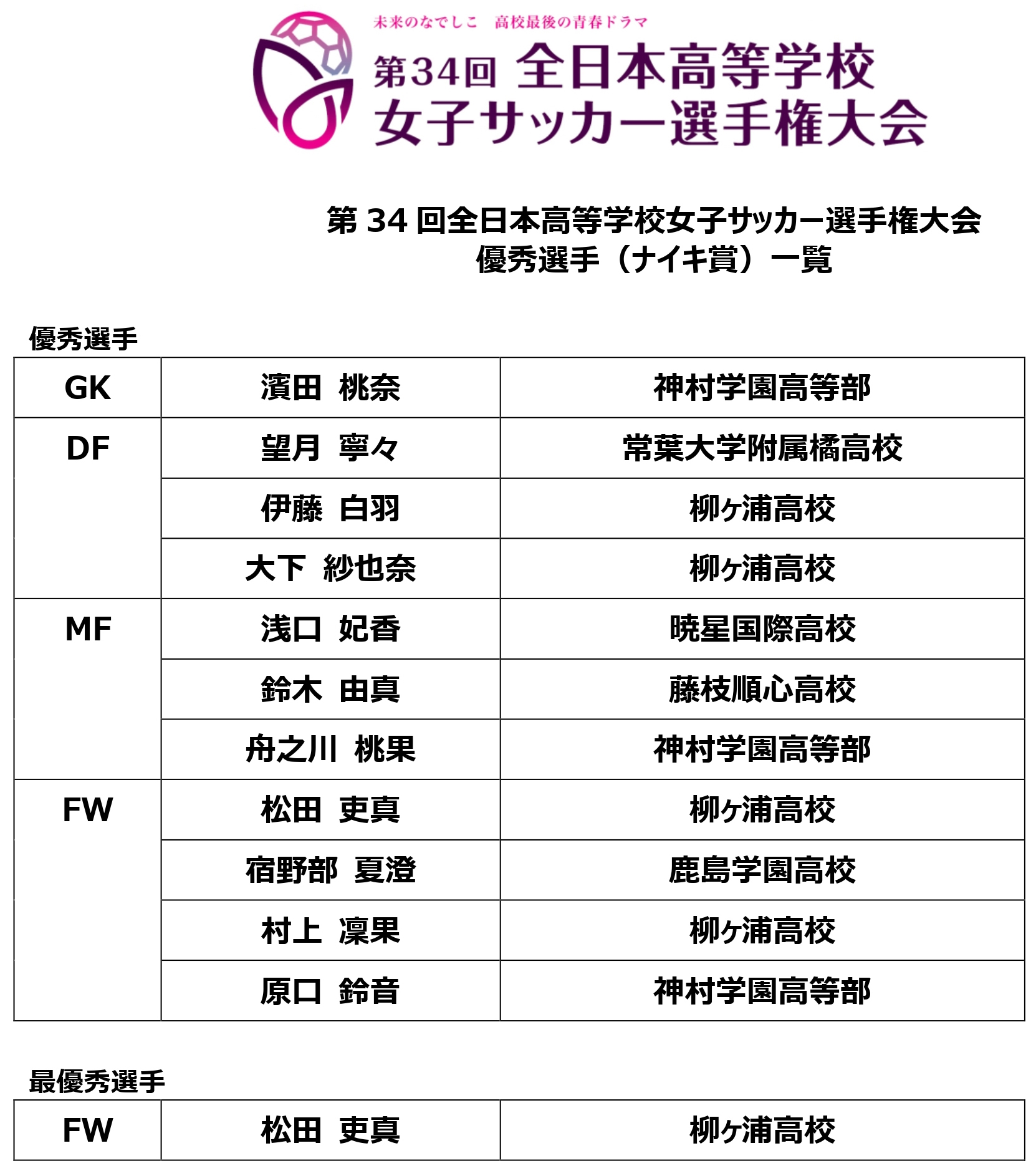また、表彰式にて、大会最優秀選手1名、優秀選手11名が「ナイキ賞」を受賞しました。