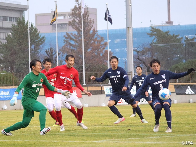 反撃の糸口を探るセレソン長野に対して、エリース東京は最終ラインや中盤の選手たちが体を張って対応。すると45分、攻撃時にわずかな隙を逃さない集中力を発揮しました。相手陣内でスローインを入れた石川清司選手がリターンを受けてクロス。ファーサイドに入り込んでいた清岡賢二郎選手が頭で決めて、大きな追加点を奪いました。