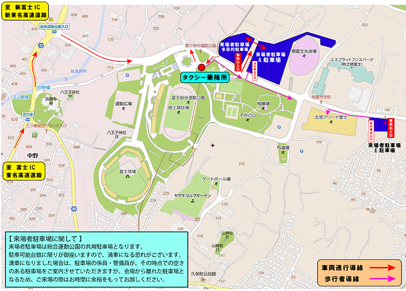 ・来場者用の駐車場は総合運動公園の共用駐車場になります。駐車可能台数に限りがございますので、満車になる恐れがございます。満車になりました場合は、駐車場の係員・警備員が、その時点での空きのある駐車場をご案内させていただきます。