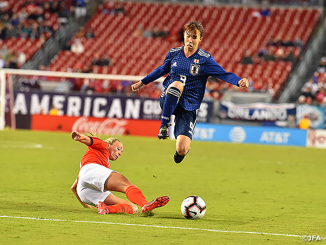 なでしこジャパンは北村菜々美が左サイドバックに入り、宝田沙織がセンターバックで出場。代表デビューとなった塩越柚歩は右サイドハーフで先発した。33℃の暑さの中、オリンピックを見据え欧州選手とのマッチアップに手応えを掴んだ一戦となった。
