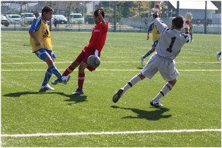 (ゴール前に飛び込む岩下航) (キーパーをかわす小材浩彰)