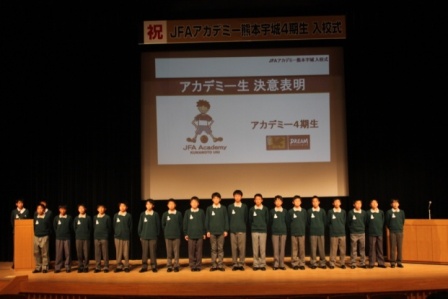 この写真は、4期生への歓迎の言葉の様子です。アカデミー在校生を代表して坂田直樹君が