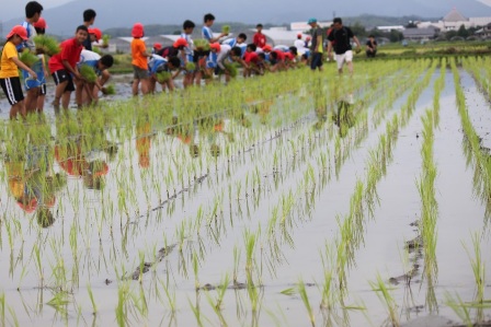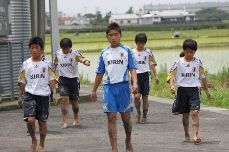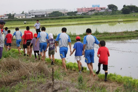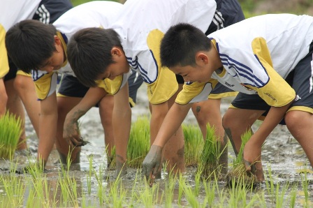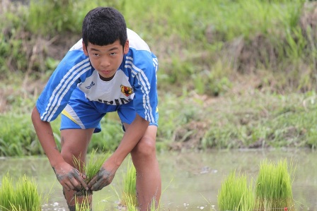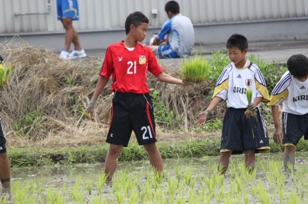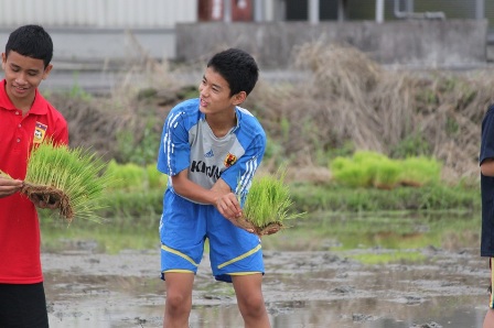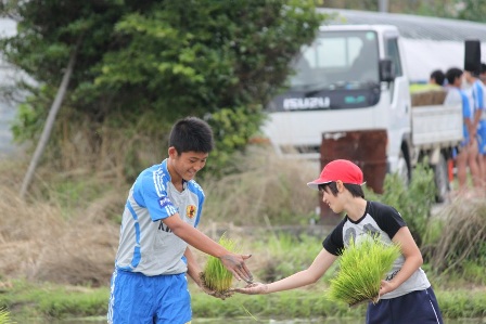 グラウンドから田んぼへとフィールドを代え、ぬかるむ足場を相手に、日本の伝統農業である田植えに