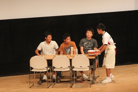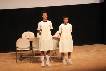 2年生は夏休みに行った職場体験をテーマにした劇で会場を笑いの渦に巻き込みました。