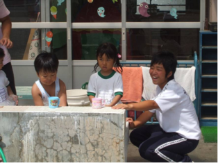 みると、プールからあがった子供たちに昼食前と言うこともあり、手洗いうがいの指導をして