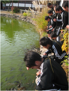 (池の魚に餌をあげて大喜び。今も昔も変わらない風景?)