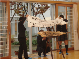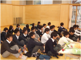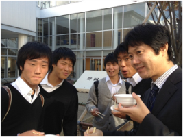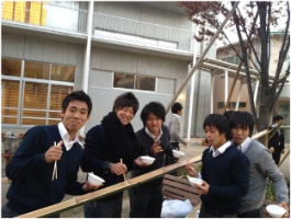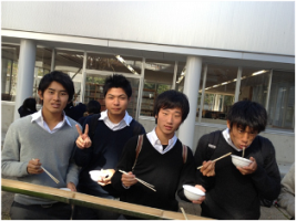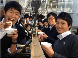(長陵祭当日は、雨のために実施できなかった「流しそうめん」を男女仲良く食するアカデミー生たち)