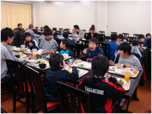 たくさん食べる高校生たちにびっくりの子供たち。