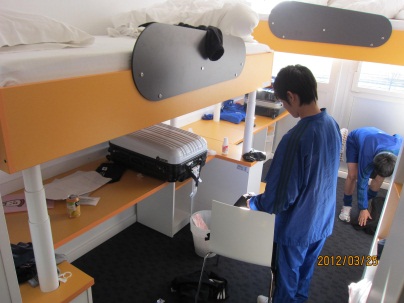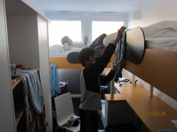 次に、私たちが寝泊まりしている部屋です。とてもきれいな部屋で二人ずつ利用させてもらっています。