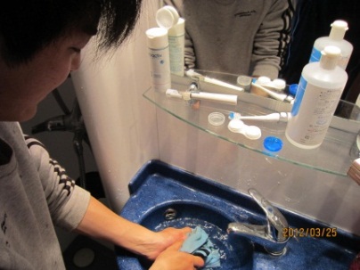 手洗いしています。手洗いは慣れてないせいか、とても苦労します。しかし、苦労して手洗いした洗濯物は