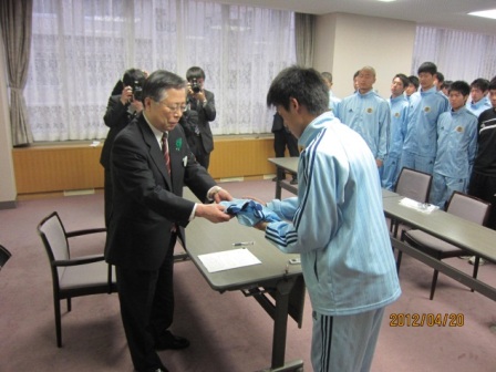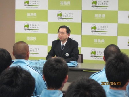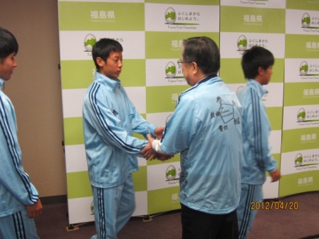 4月20日、男子ユース39名とスタッフ5名で福島県庁を訪れ、佐藤雄平知事と内堀雅雄副知事を