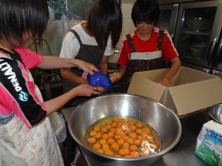 こちらはプリン担当。殻が入らないように90個の卵を割ります。