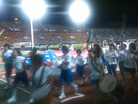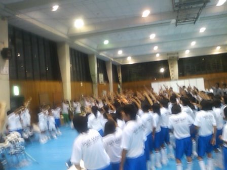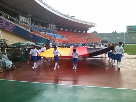 グラウンドで広げて行進するという大役である。途中雨も降り、トラックやピッチが歩きにくい状態に
