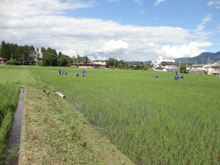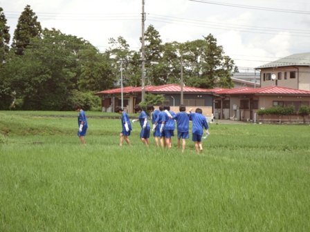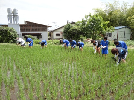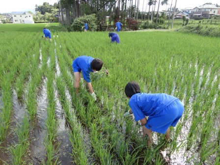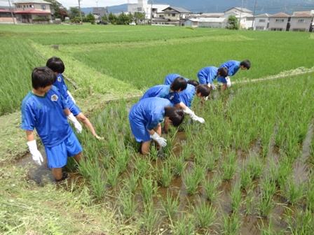 先月、田植えをさせていただいた田んぼに、今回は中学生で草引きをしに行きました。