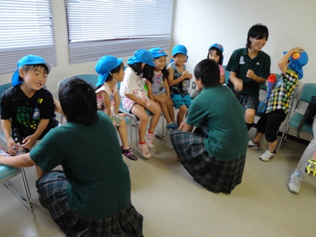 開会式までの時間には、保育園児と話をしたり、それぞれ夏休みの宿題をしたりして過ごしました。