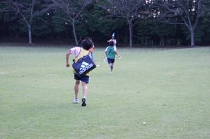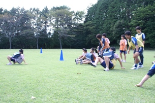 スパイダーはお腹の上にランドカバンをのせて競争します。富士岡中の体育祭で経験したことが