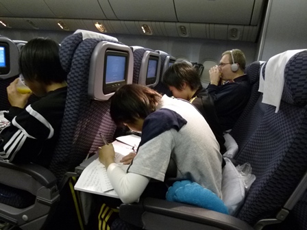 乗り換え後の飛行機では、必死に宿題を進めている人が多く見られました。