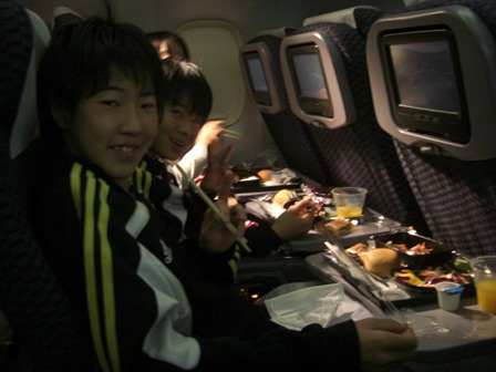 機内での時間の使い方は、寝る、映画を見る、学校の宿題をする、と様々でした。