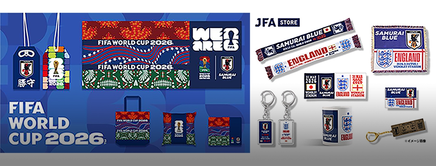 サッカー日本代表オフィシャルグッズ FIFAワールドカップ2026の大会ロゴを使用したオフィシャルグッズと3.31イングランド代表戦のマッチデーグッズを販売
