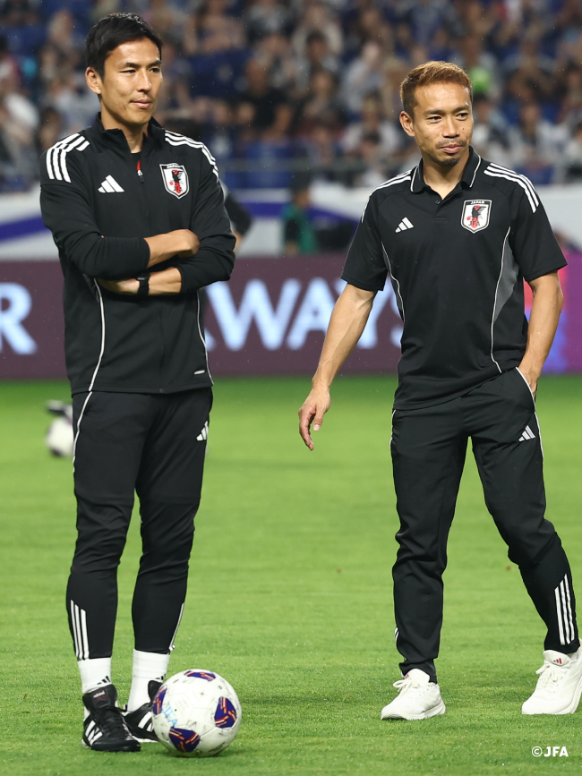 ――現在、代表活動中はどういう役割を担っているのでしょうか。 「みなさんご存知の通り、名波さんが攻撃を担われていて、守備の部分では俊さん、セットプレーは前田さん。前田さんは攻撃も担当されたりしていますが、その中で自分は守備のところを俊さんと一緒にやってほしいと言われています。ただ、守備だけではなく攻撃のところでも名波さんが意見を求めてくださって。『こういう時はどう思う?』『このシーンはどう思う?」という会話の中で、攻撃に関しても自分の意見を言わせていただくこともあります。基本的な役割としてはどちらかといえば守備がメインではありますが、いろいろなことに口を突っ込ませていただいています(笑)」