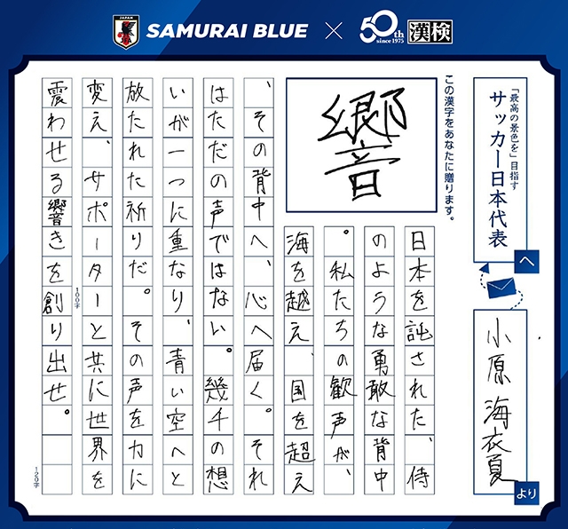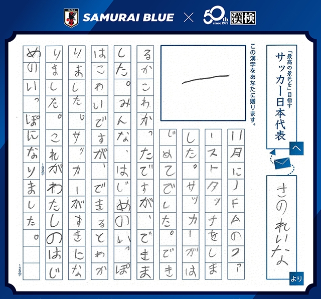 生涯スポーツとしてのサッカーと生涯学習としての日本語・漢字の振興を通じてスポーツと学びの楽しさや喜びを伝えていくことを目的に取り組むものです。FIFAワールドカップ26に向けたSAMURAI BLUE(サッカー日本代表)の合言葉「最高の景色を2026 FOR OUR GREATEST STAGE」とも連動し、年間を通じてSAMURAI BLUEを応援する特別コラボ企画を行っています。