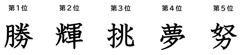 また、本コンテストに応募されたSAMURAI BLUE(サッカー日本代表)に贈られた漢字一字の集計結果では、「勝」が1位となりました。トップ5にランクインした漢字を紹介します。