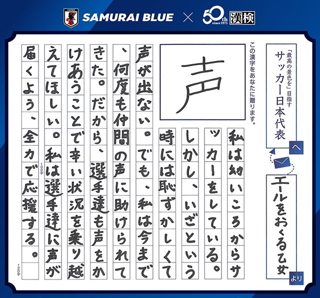 受賞作品の詳細は、コンテストサイト(URL:https://www.kanken.or.jp/kanji-contest/jfa-samuraiblue/)をご覧ください。