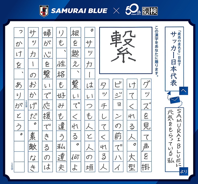 今、あなたに贈りたい漢字コンテスト「SAMURAI BLUEを応援しようキャンペーン!」にご応募いただいた全国の皆さまに、心より御礼申し上げます。本コンテストには、全国から1,760通の応募がありました。SAMURAI BLUE(サッカー日本代表)に贈る漢字として、364種類の漢字が寄せられました。それらの漢字と応援メッセージには、これまでのワールドカップでの戦いを通じて得た感動、北中米ワールドカップに向けた期待、そしてサッカーという競技そのものから得られた教訓や感謝など、皆さまのさまざまな想いが込められていました。漢字は一字ごとに意味を持つ「表意文字」です。だからこそ、皆さまが寄せてくださった応援の気持ちが、364種類もの多様な漢字として表現されたのだと思います。