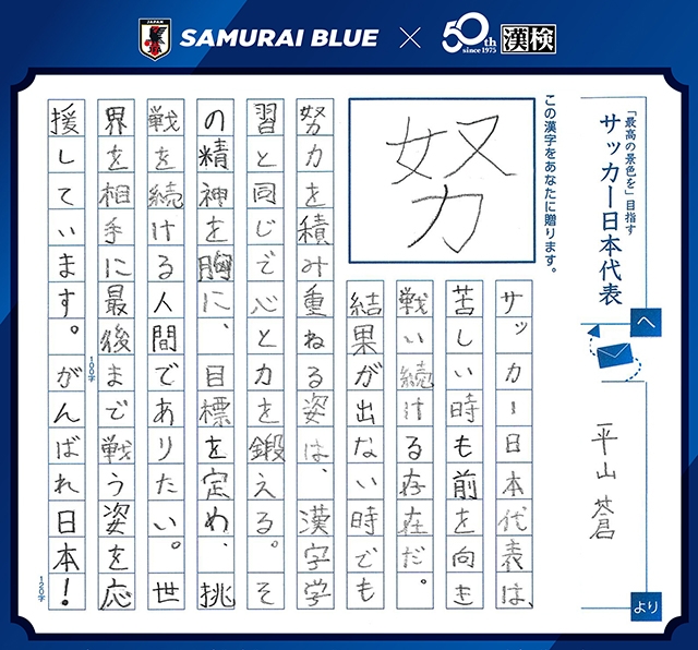 日本サッカー協会(JFA)と公益財団法人 日本漢字能力検定協会(本部:京都市東山区/代表理事:山崎信夫/以下、漢検協会)が2025年6月から実施しているコラボレーション企画「全力蹴球プロジェクト」。その取り組みのひとつである「今、あなたに贈りたい漢字コンテスト『SAMURAI BLUEを応援しようキャンペーン!』」の受賞作品が決定しました。