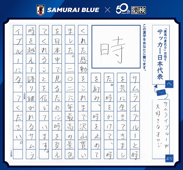 「今、あなたに贈りたい漢字コンテスト」は、漢検協会が2013年から実施しているもので、普段言えない素直な気持ちを込めた「漢字一字とメッセージ」を募集し表彰するコンテストです。このコンテストの特別版として、2025年9月30日から2026年1月16日の期間で、FIFAワールドカップ2026に臨むSAMURAI BLUE(サッカー日本代表)への想いを込めた「漢字一字と応援メッセージ」を募集しました。