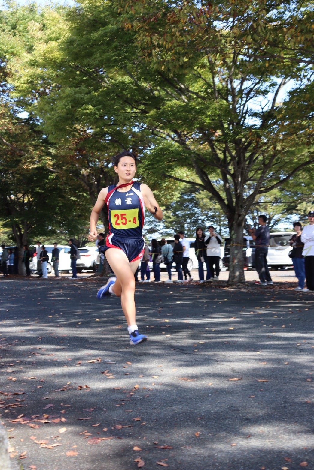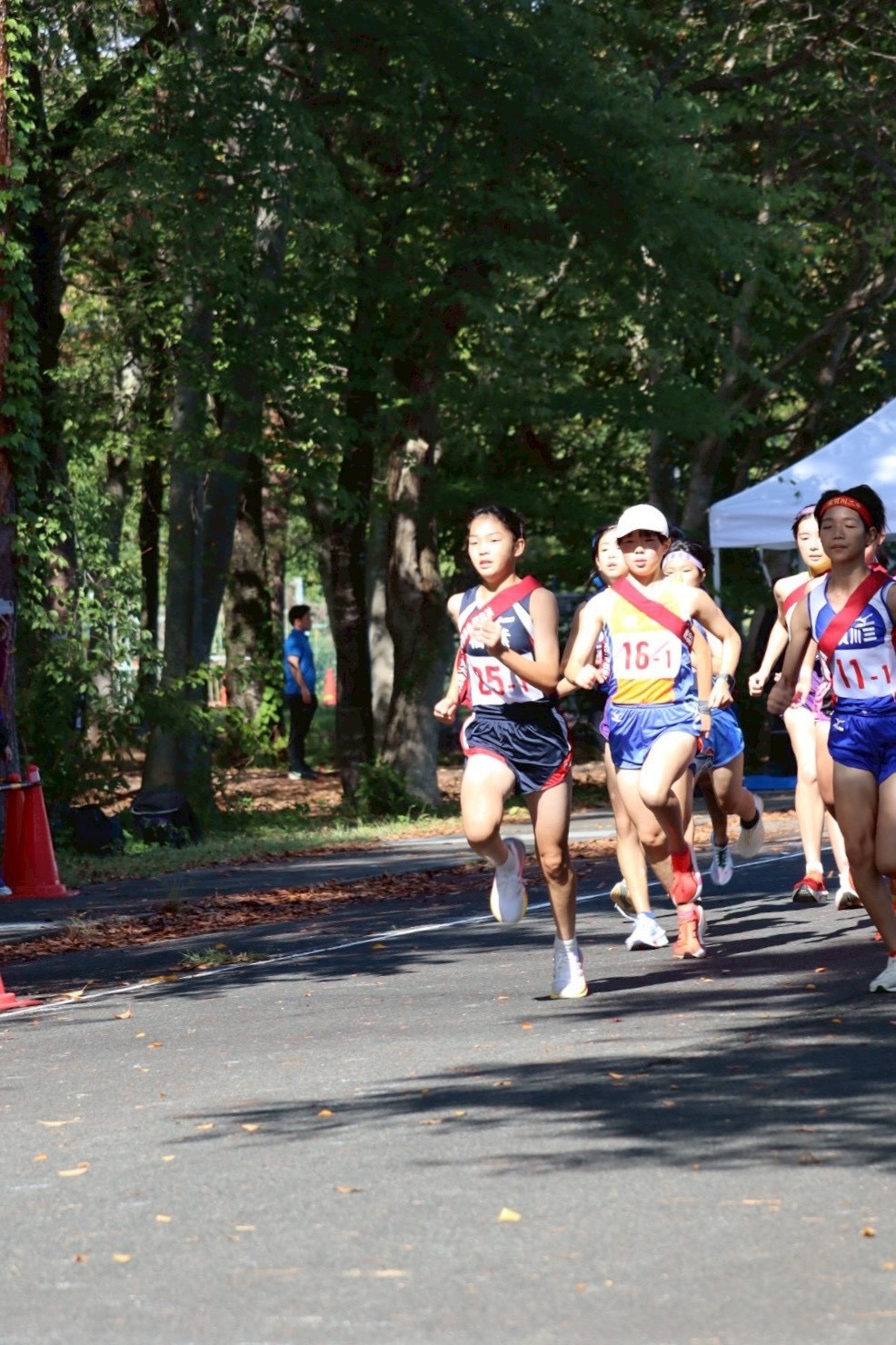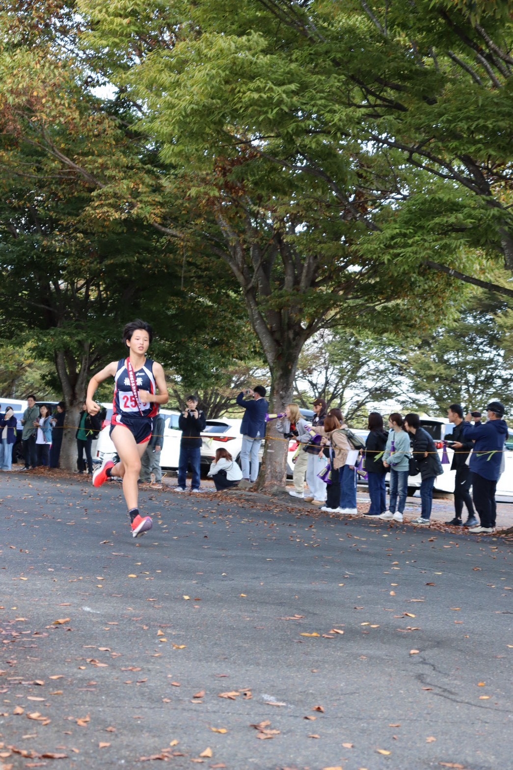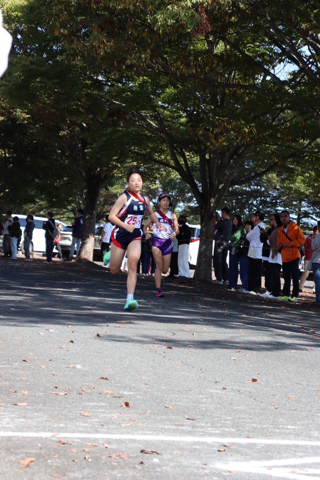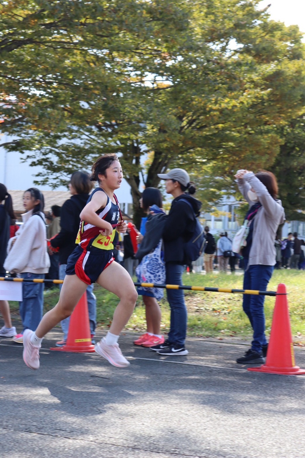 大会当日、スタートのピストルが鳴りました。1区の芽依、2区の瑠奈、3区のさくらが私まで2位で襷をつないでくれました。直前までガチガチに緊張していた私も、みんなの走りを見て勇気をもらいました。襷を受け取ると、もう緊張はしていませんでした。1位とは差が結構あったけれど、後ろは気にせず前だけを見て走りました。折り返し地点まで来て残り1キロになったとき、いつもなら後半で失速してしまう私も、みんなからの声援を受け、「絶対にペースを落としちゃダメだ」と自分に言い聞かせました。
